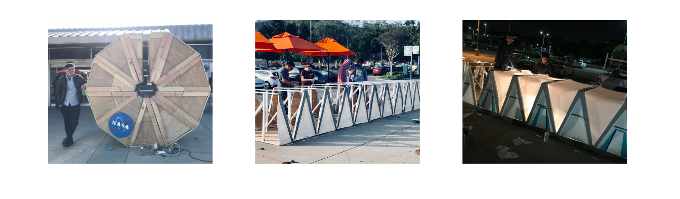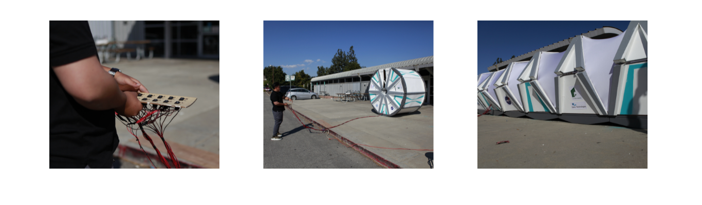 The final physical prototype was built on two scales, a full-scale and a quarter-scale, respectively. The full-scale model displays the interior configuration through AR technology to understand ergonomics and human scale. At the same time, the quarter-scale prototype was to demonstrate the mechanisms and connections during deployment and inflation. I participated in the design and building of the quarter-scale prototype and was in charge of the whole mechanism's circuits and controls. Since, in the beginning, I had zero knowledge of circuits and controls, I learned via Google and YouTube, and eventually, the prototype successfully unfolded the way we wanted.